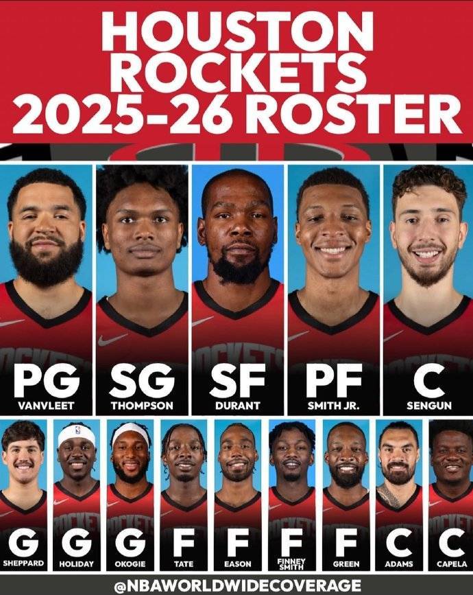 火箭目前阵容除上述五人外,还包括谢泼德、霍乐迪、奥科吉、泰特、伊森、芬尼-史密斯、杰夫-格林、亚当斯和卡佩拉。(搜狐体育编辑:JS)